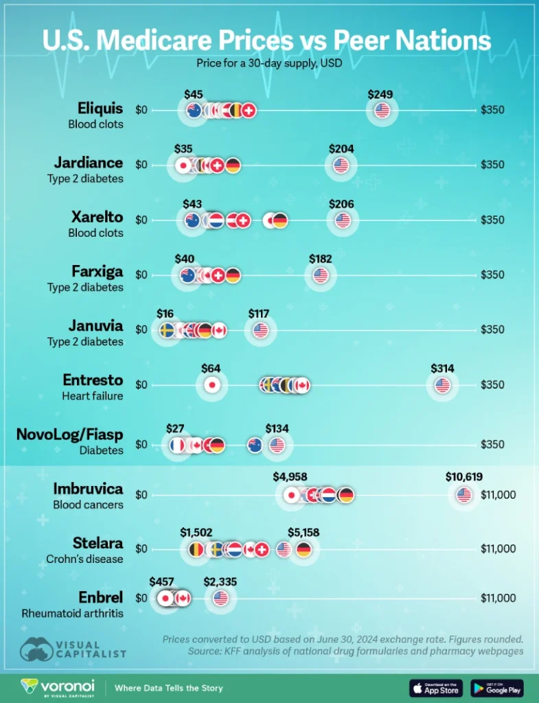 مدیکر (Medicare)، برنامه بیمه درمانی دولت آمریکا که عمدتاً برای سالمندان است، نزدیک به ۶۵ میلیون آمریکایی را تحت پوشش قرار میدهد؛ اما به چه قیمتی؟ علیرغم مقیاس گسترده این بیمه، مدیکر اغلب برای داروهای تجویزی هزینه بسیار بیشتری نسبت به سیستمهای بهداشتی در سایر کشورهای ثروتمند پرداخت میکند. اینفوگرافی زیر، مقایسه قیمت ۱۰ داروی مهم برای مصرف ۳۰ روزه با استفاده از دادههای پترسون-کیافاف را به تصویر می کشد.