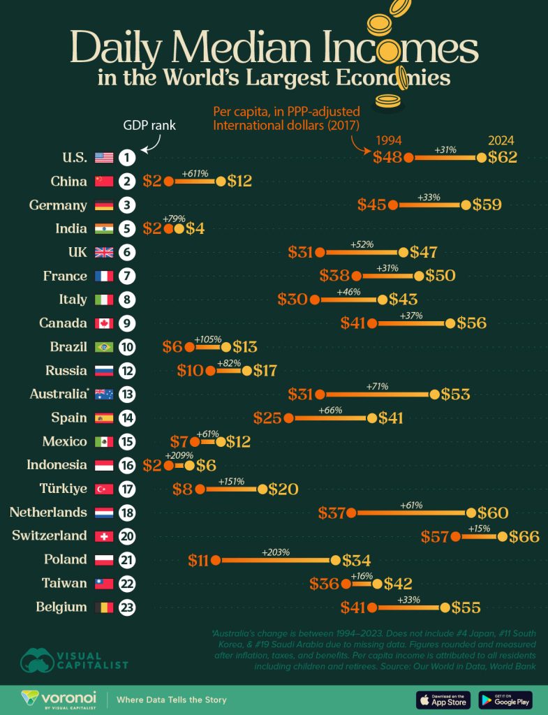 برای پاسخ به این پرسش، دادههایی از وبسایت Our World in Data بررسی شدهاند که درآمد میانه روزانه در ۲۰ اقتصاد بزرگ جهان را از سال ۱۹۹۴ تا ۲۰۲۴ به تصویر میکشند. نکته قابل توجه این است که این ارقام بر اساس «دلار بینالمللی تعدیلشده بر مبنای برابری قدرت خرید (PPP)» محاسبه شدهاند؛ یعنی با در نظر گرفتن تفاوت قیمتها و هزینههای زندگی در کشورهای مختلف. همچنین تمام ارقام با در نظر گرفتن نرخ تورم، مالیات و مزایای اجتماعی تنظیم شدهاند.