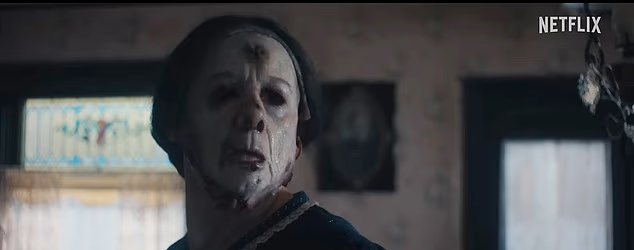 در نمایی هولناک، گین لباسی تیره پوشیده و پوست سر زنی با موهای سیاه را روی سر خود میگذارد و صورت او را به چهرهاش میچسباند.