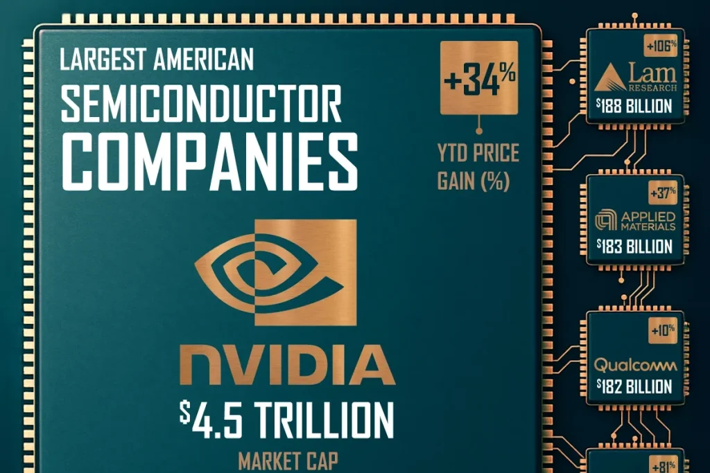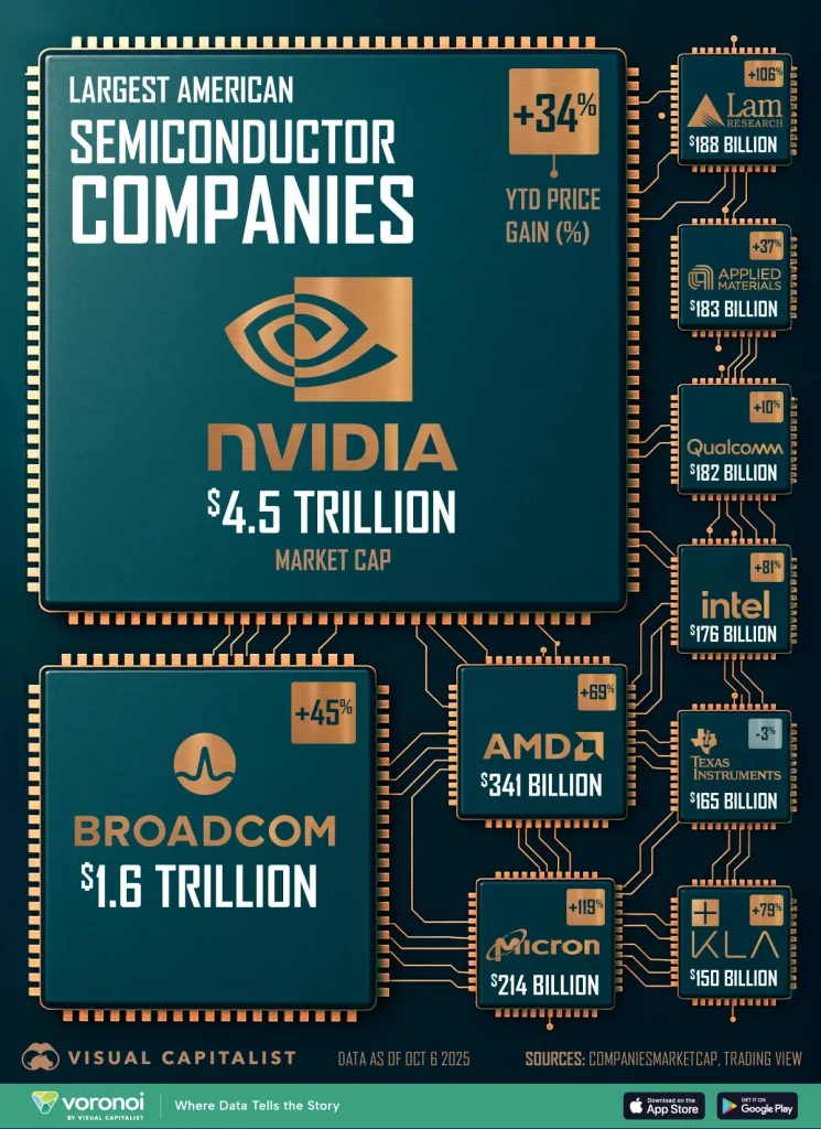 این جدول بزرگترین شرکتهای نیمهرسانای آمریکا را از نظر ارزش بازار نشان میدهد (بر اساس آمار سایت CompaniesMarketCap تا ۶ اکتبر ۲۰۲۵):