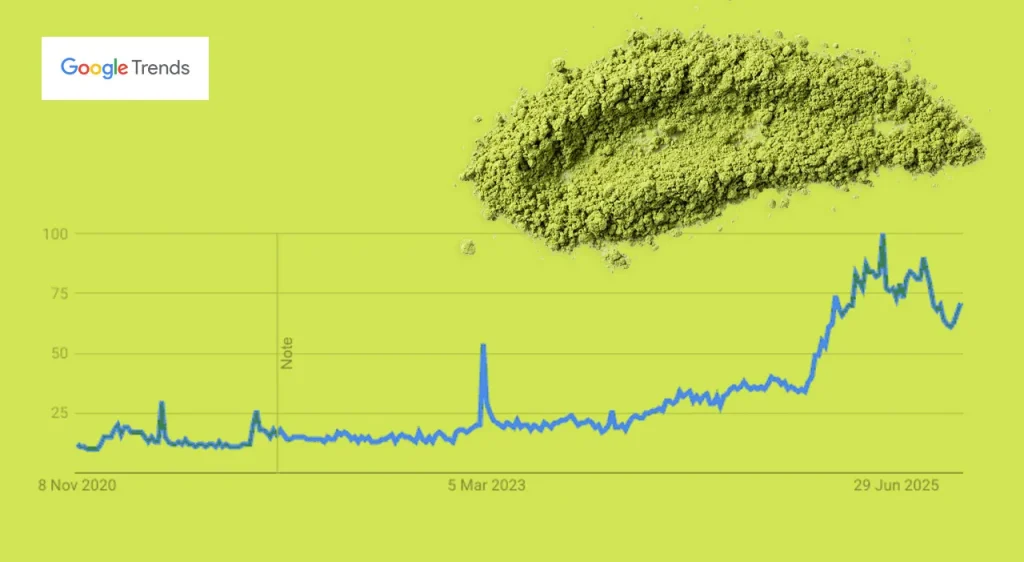 بر اساس دادههای گوگل ترندز، محبوبیت این نوشیدنی طی پنج سال گذشته پیوسته افزایش داشته و از دسامبر ۲۰۲۴ جهشی ناگهانی را تجربه کرده است. این ابزار نشان میدهد که دفعات جستوجوی عبارت «ماچا» از سال ۲۰۲۰ تا امروز روند صعودی قابلتوجهی داشته است. جستوجوهایی مانند «چرا ماچا مفید است»، «از کجا ماچا بخرم» و «لاته ماچا چه طعمی دارد» در تمام دنیا افزایش یافتهاند.