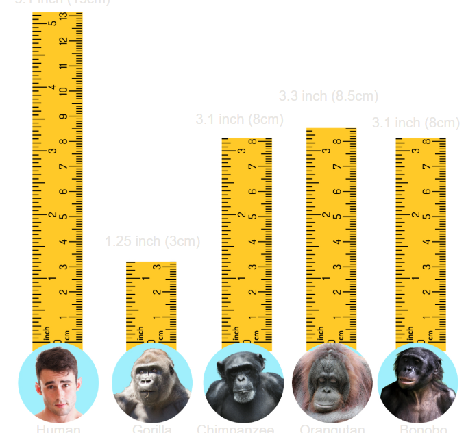 یکی از پرسشهای قدیمی در زیستشناسی تکاملی این است که چرا اندازه آلت تناسلی انسان، نسبت به اندازه بدن، از سایر نخستیسانان بزرگتر است. برای مقایسه، میانگین طول آلت تناسلی مردان انسان در حالت نعوظ حدود ۱۳ سانتیمتر است، در حالی که این عدد در شامپانزه و بونوبو حدود ۸ سانتیمتر، در اورانگوتان حدود ۸٫۵ سانتیمتر و در گوریل تنها حدود ۳ سانتیمتر گزارش شده است. پژوهشگران این مطالعه معتقدند که انتخاب جنسی، هم از طریق ترجیح زنان و هم از طریق رقابت میان مردان، میتواند یکی از عوامل اصلی این تفاوت باشد.