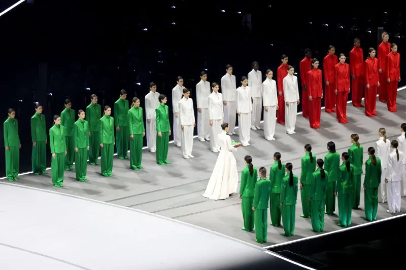 در بخش هنری مراسم، ویتوریا چرتی با لباسی سفید و بلند از مجموعه آرمانی ظاهر شد؛ لباسی مینیمال اما پرجزئیات که با طراحی ساده و یقهای شاخص، بر رسمیبودن فضا و شکوه مراسم تأکید داشت. پس از او، گروهی از مدلها با لباسهایی در رنگهای سبز، سفید و قرمز، رنگهای پرچم ایتالیا، وارد صحنه شدند و ترکیبی هماهنگ از مد، هویت ملی و پیام فرهنگی را شکل دادند.