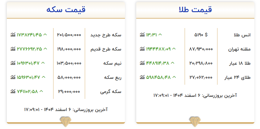 قیمت دلار، طلا و سکه در بازار امروز، چهارشنبه ۶ اسفند ماه سال ۱۴۰۴، اعلام شد.